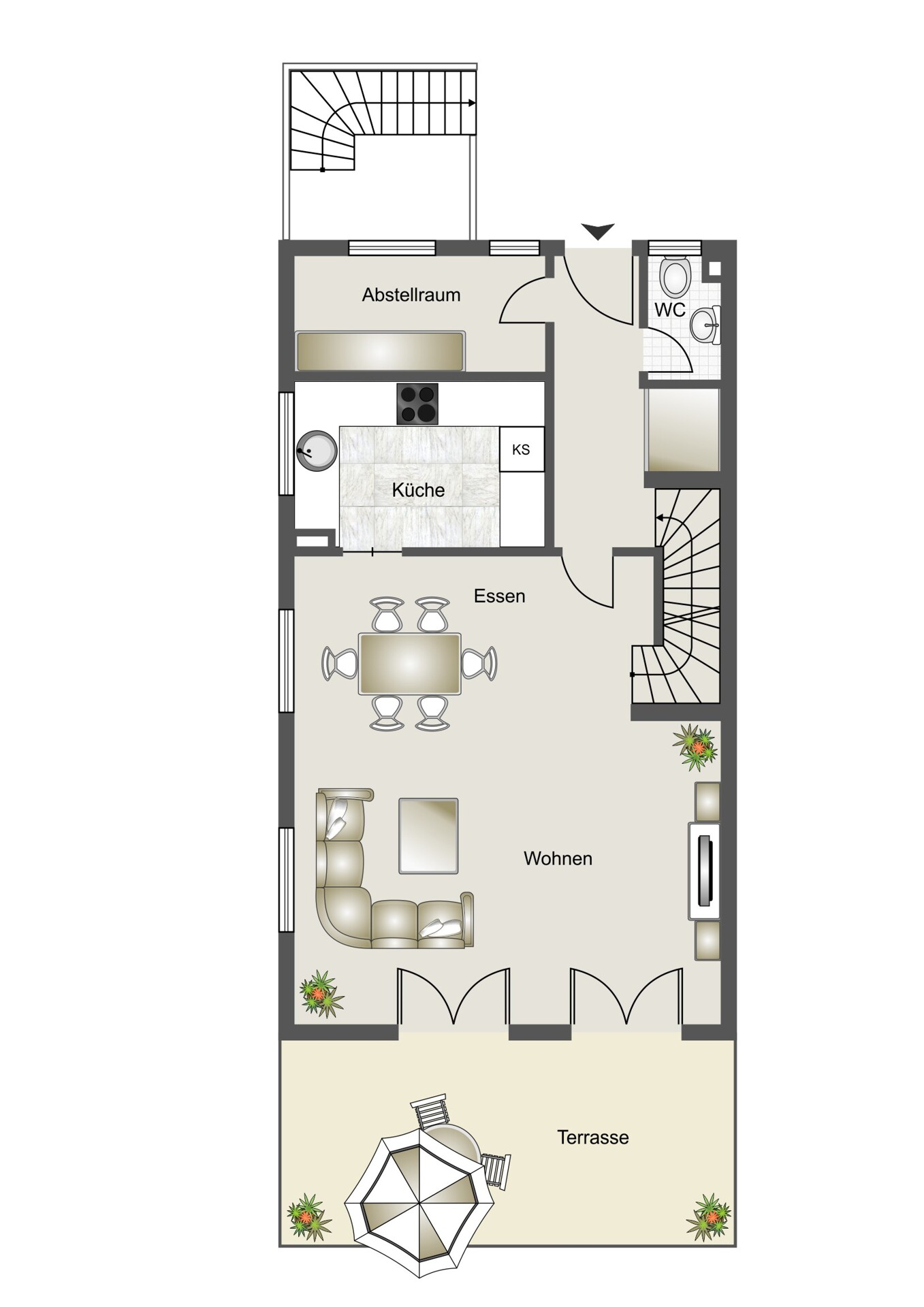 Über wenige Treppenstufen gelangen Sie in den einladenden Eingangsbereich des Hauses. Ein praktischer großer Abstellraum sowie ein Gäste-WC sorgen für Ordnung und Komfort im Familienalltag.
