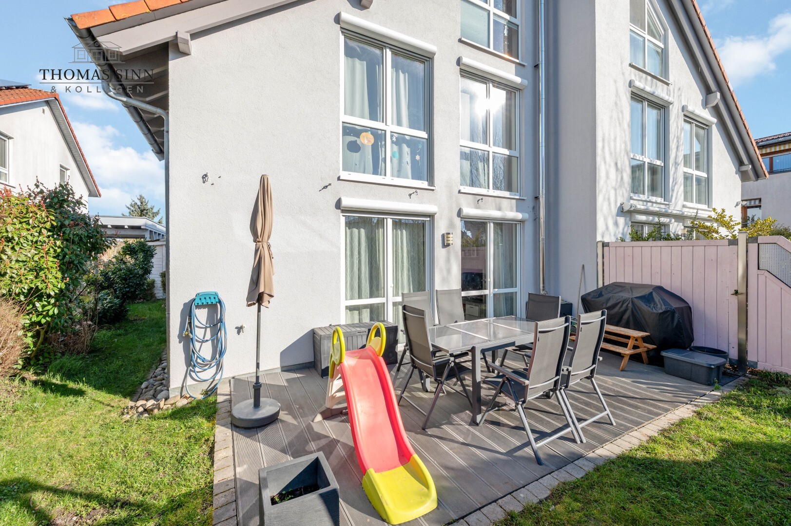 Ein besonderes Highlight für die ganze Familie ist der pflegeleichte Garten mit moderner Terrasse. Ob gemeinsames Abendessen im Freien, Kindergeburtstage oder entspannte Sommerabende – hier genießen Sie geschützte Stunden mit Blick in den Garten. Über den Garten erreichen Sie mühelos das Gerätehaus am Carport vor dem Haus der sich ideal zur Aufbewahrung von Fahrrädern, Spielsachen und Gartenutensilien eignet.