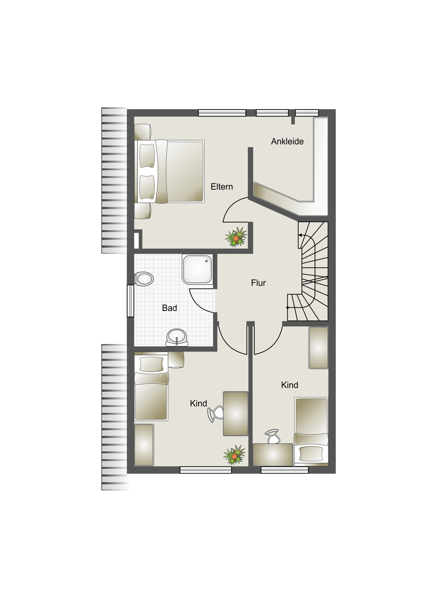 Im Obergeschoss stehen ein Elternschlafzimmer mit Ankleidebereich und Einbauschränken sowie zwei großzügige Kinderzimmer zur Verfügung, die ausreichend Platz zum Spielen, Lernen und Entspannen bieten. Das große Familienbad mit Tageslicht ist funktional und zugleich komfortabel ausgestattet.