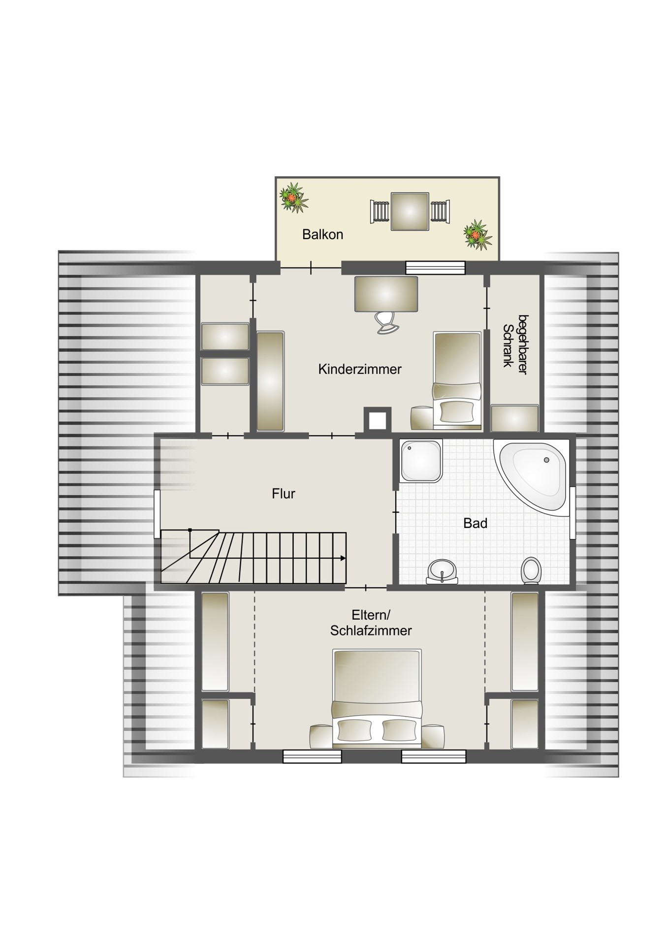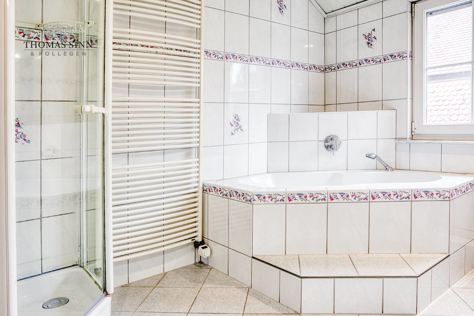 Über die baujahrtypische Holztreppe mit klassischem Handlauf, erreicht man die Schlafebene. Hier befinden sich das Elternschlafzimmer, das Badezimmer sowie ein Kinderzimmer. Vom Kinderzimmer hat man Zugang auf den Balkon Richtung Garten. Das Badezimmer ist mit Eckwanne, Dusche, Waschtisch und WC ausgestattet.