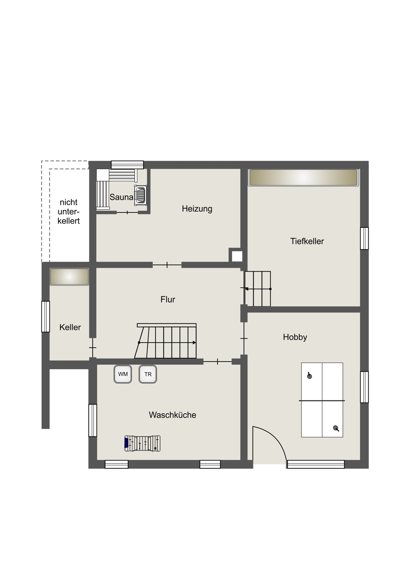 Im UG des Gebäudes befinden sich ein Kellerraum, die Waschküche, ein praktischer Tiefkeller sowie der Technikraum mit eingebauter Sauna. Der Hobbyraum ist komplett mit Tageslicht ausgestattet und hat direkten Zugang vor das Gebäude. Der Raum wäre somit auch gut für eine gewerbliche Nutzung z.B. als kleines Büro nutzbar.