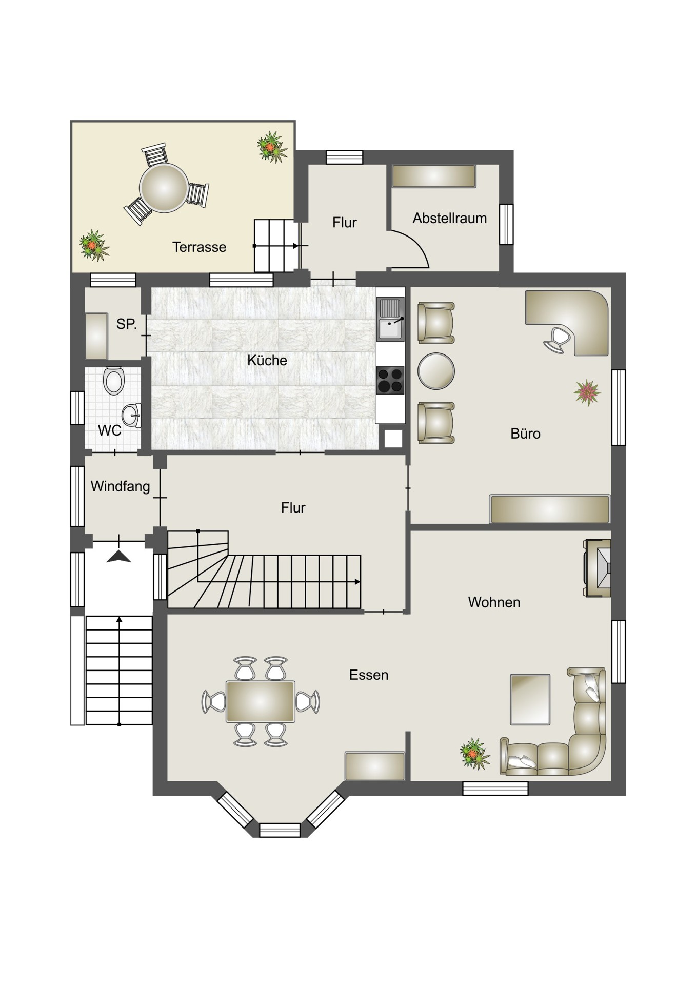 Über die große Eingangsdiele betritt man das Gebäude. Von hier aus gelangt man linker Hand in die Küche mit Speisekammer und Zugang auf die große, mit einer Pergola überdachten Terrasse im Garten. Hier genießen Sie in den warmen Sommermonaten Ihren verdienten Feierabend im Kreise Ihrer Familie. Die Gartenfläche bietet genügend Platz für Trampolin & Co.