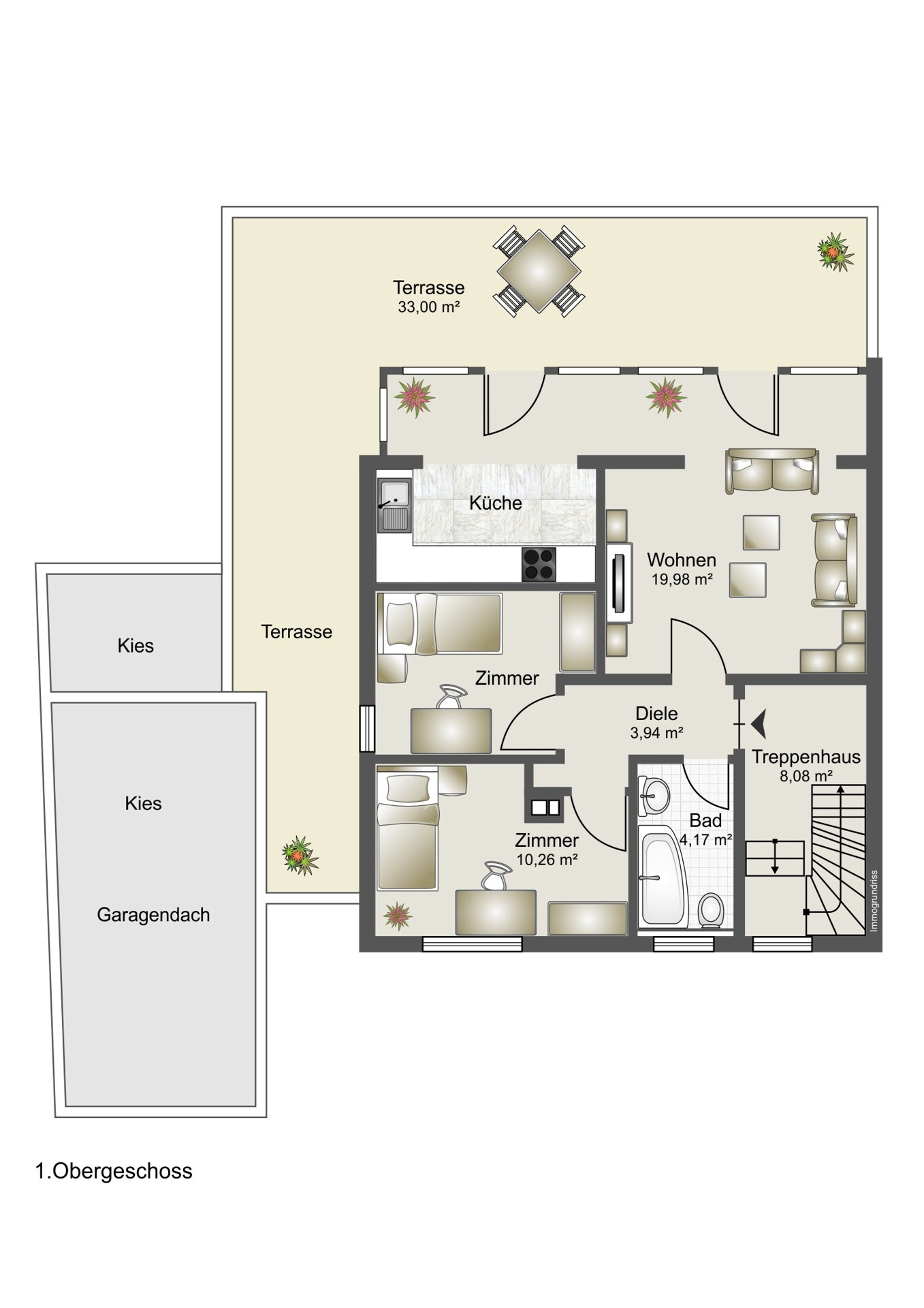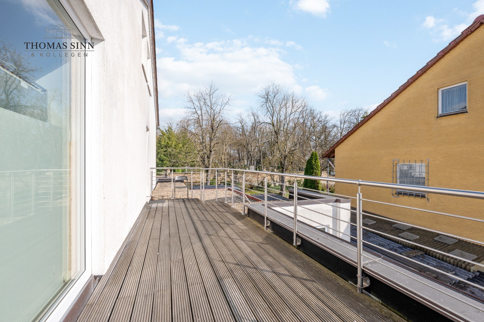 Über die Innentreppe wird das OG mit einer 3 Zimmer Wohnung, Küche und Bad erschlossen. Von hieraus haben Sie Zugang auf die riesige Terrasse die komplett entlang des Anbaus verläuft. Im DG befindet sich ein weiteres 2,5 Zimmer Apartment mit Küche Bad und WC.