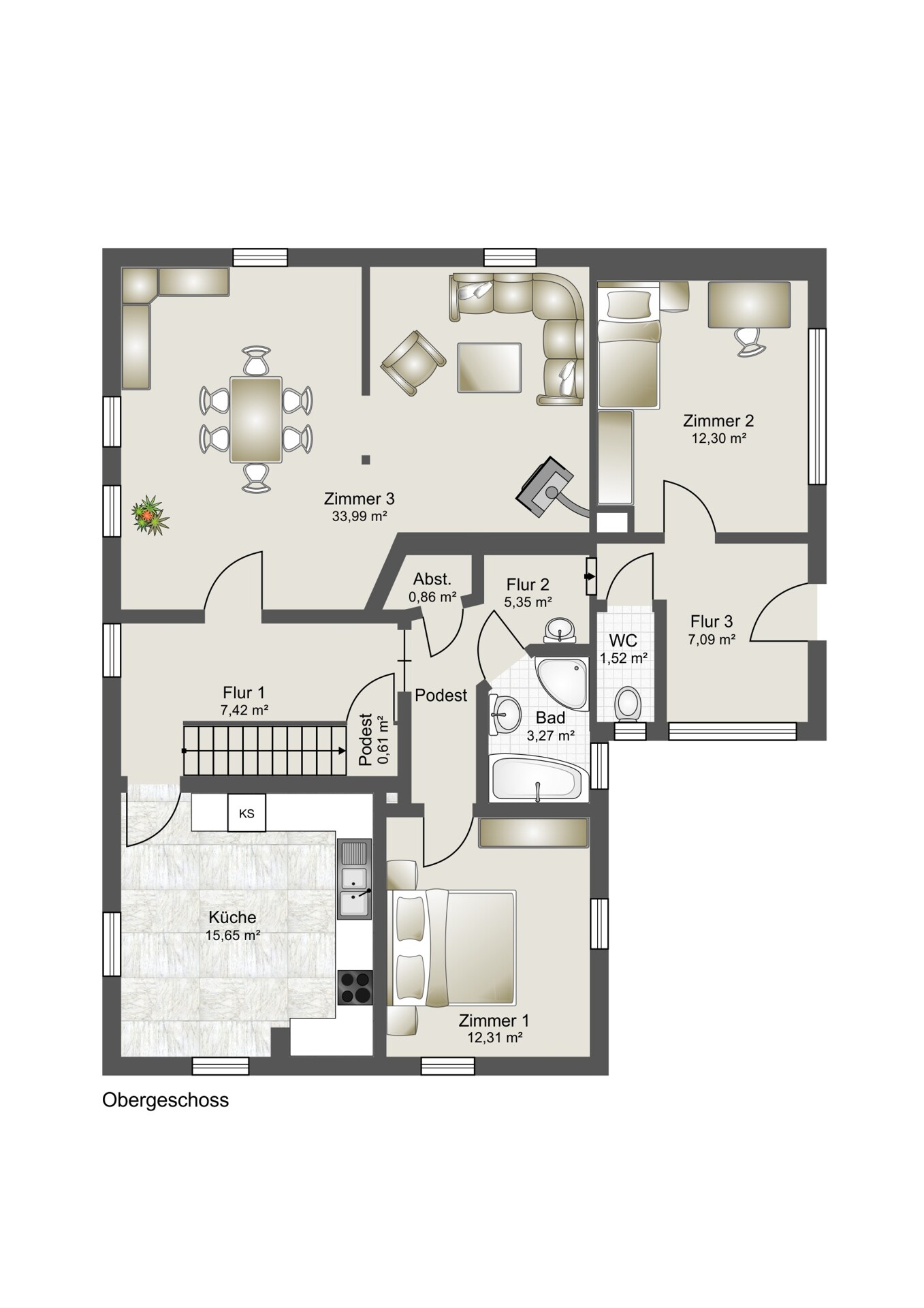 Obergeschoss: Küche, Badezimmer, separates WC, drei Zimmer