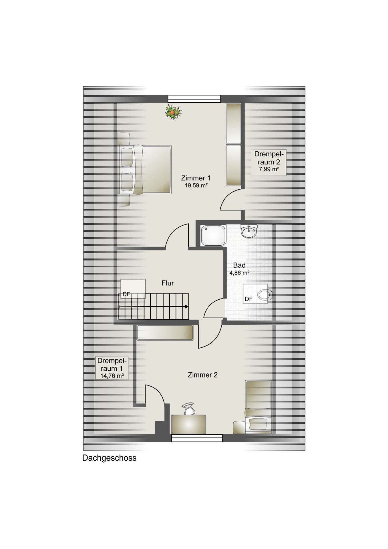 Dachgeschoss: Badezimmer, zwei Zimmer