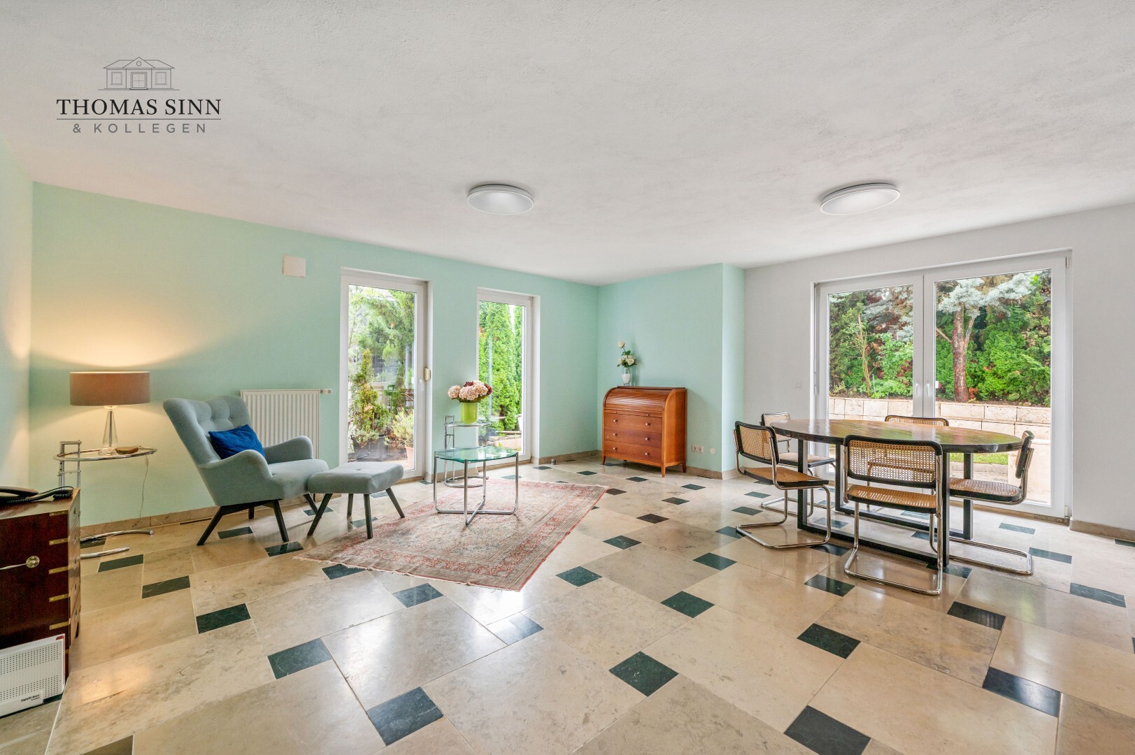 Vom Wohnbereich aus gelangt man direkt auf die große Terrasse mit Blick auf den liebevoll angelegten Garten und einen kleinen Teich – ein echtes Highlight für Gartenliebhaber.