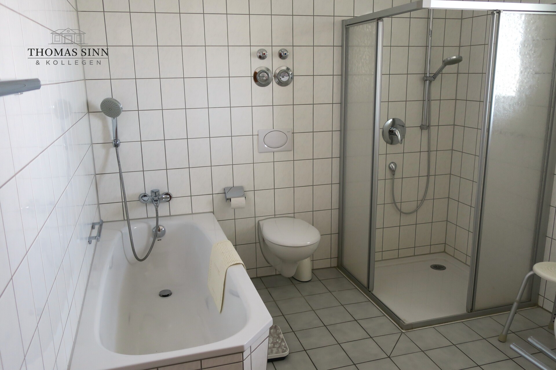 Das Tageslichtbad ist mit Badewanne und bodentiefer Dusche gut ausgestattet. Ein Waschmaschinenanschluss ist hier ebenfalls eingebaut. Im Flur gibt es eine kleine Abstellkammer sowie ein zusätzliches Gäste-WC.