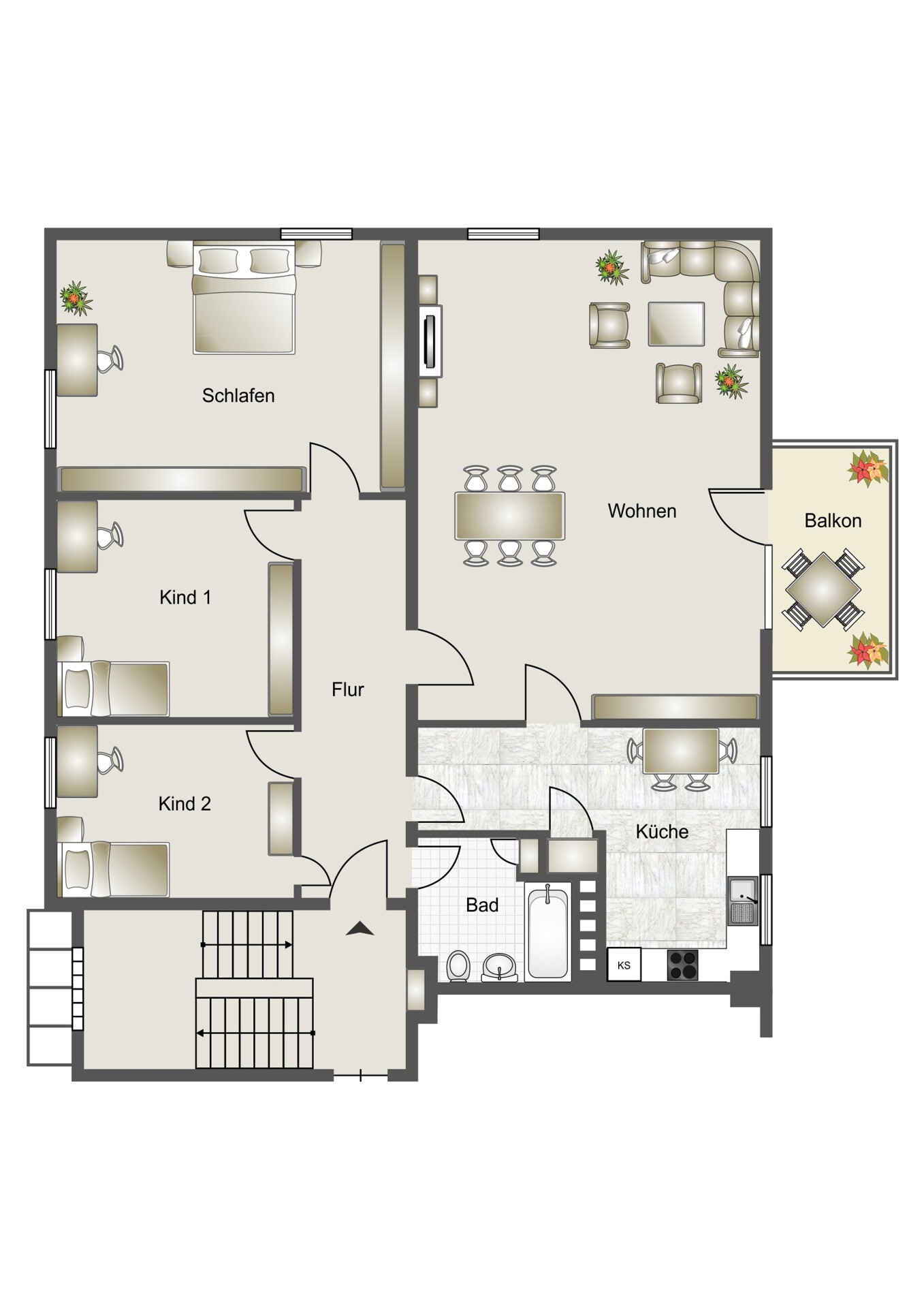 Diese wunderbar geräumige Wohnung befindet sich im 3.OG und besteht aus 3 Schlafzimmern, einem sehr großem Wohn-/Essbereich mit Balkon, einer Küche mit neuwertiger Einbauküche sowie einem großen Badezimmer mit Wanne, Dusche, WC und Bidet. Vom geräumigen Wohnzimmer hat man direkten Zugang zum Balkon mit schönem Blick ins Grüne. Hier lässt es sich in den Sommermonaten geschützt und entspannd sitzen und den Alltagsstress vergessen.