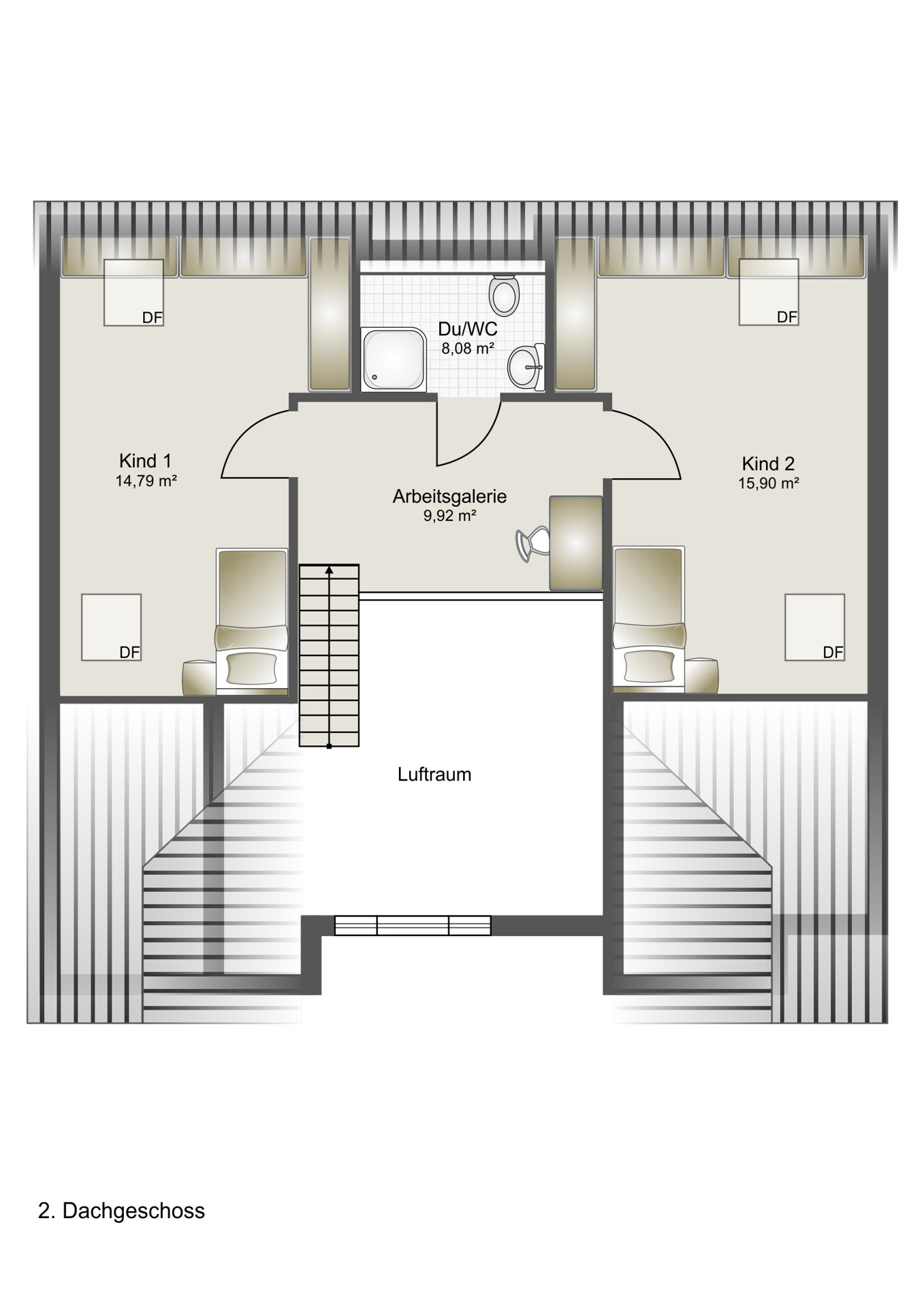 Eine stilvolle Holztreppe führt hinauf zur offenen Galerie im Dachgeschoss. Dank der schönen Sichtachse in die Natur eignet sich dieser Bereich ideal als inspirierender Arbeitsplatz oder Homeoffice. Links und rechts der Galerie befinden sich die beiden geräumigen Schlafzimmer. Zwischen den beiden Räumen wurde zudem ein zweiter Sanitärbereich mit Dusche geschaffen, sodass auf dieser Ebene ebenfalls ein komfortables Bad zur Verfügung steht.