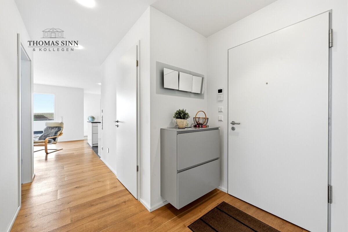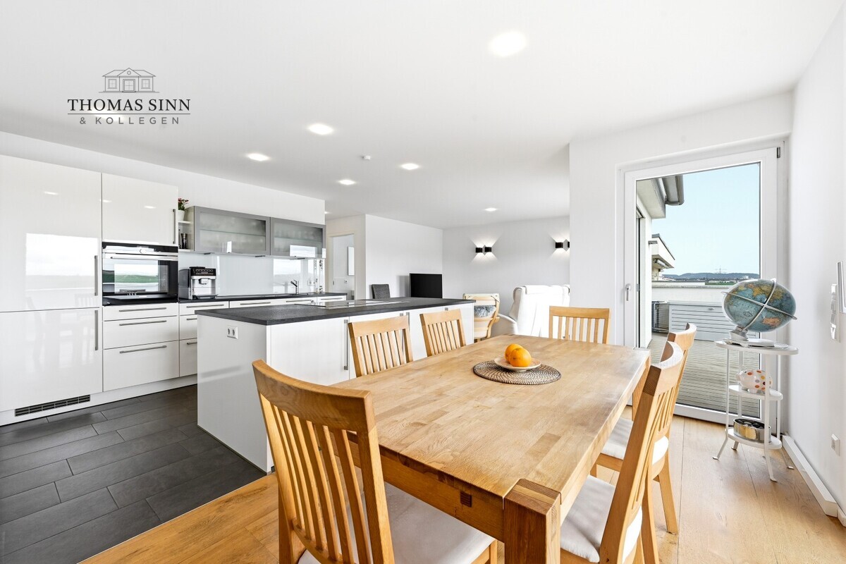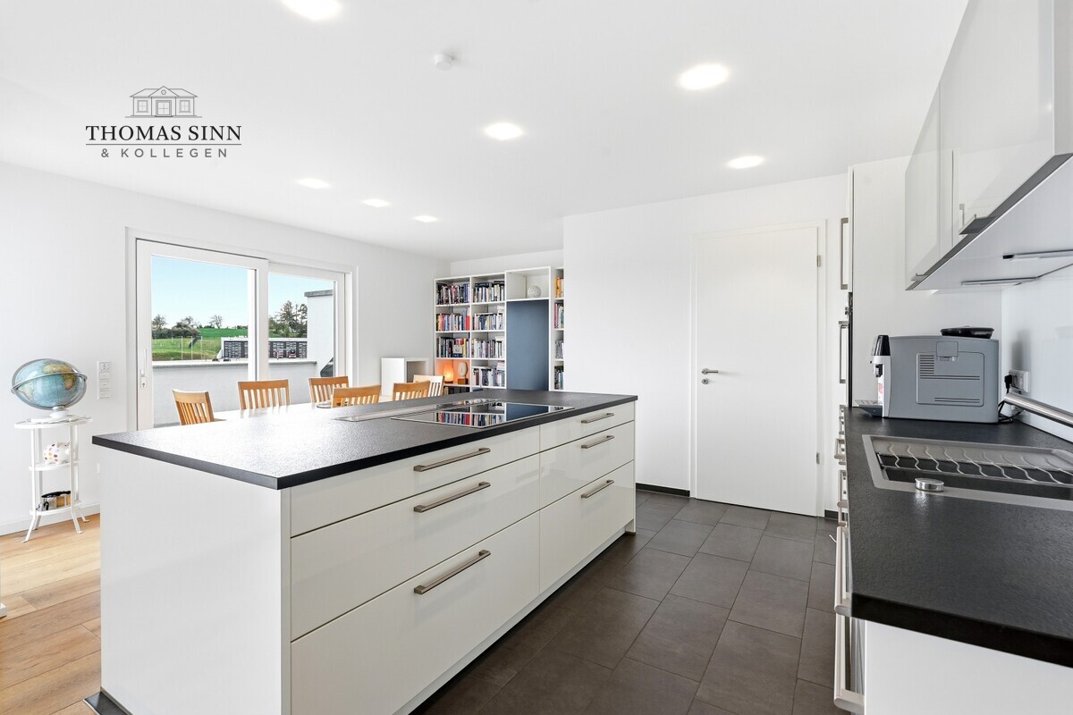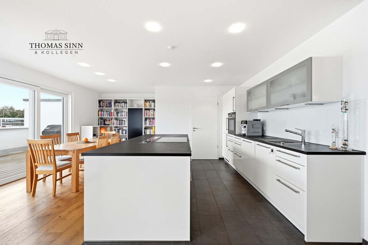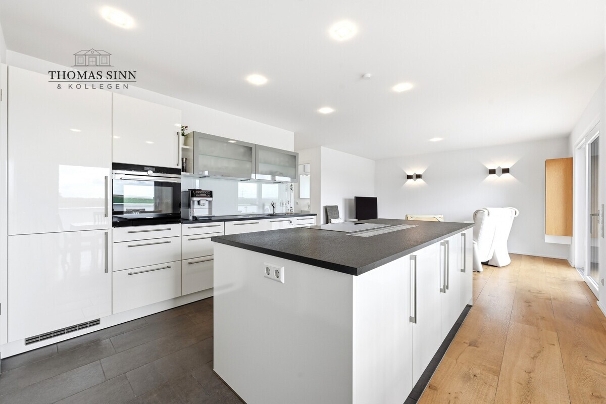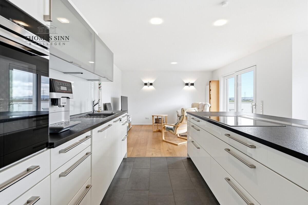 Die stilvoll integrierte, offene Küche fügt sich harmonisch in den Wohnbereich ein und unterstreicht das moderne, kommunikative Wohnkonzept. Die hochwertige Einbauküche mit Markengeräten ist bereits im Kaufpreis enthalten und bietet optimale Voraussetzungen für kulinarische Entfaltung.