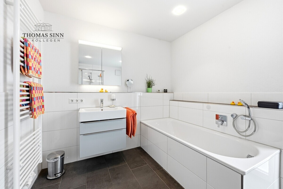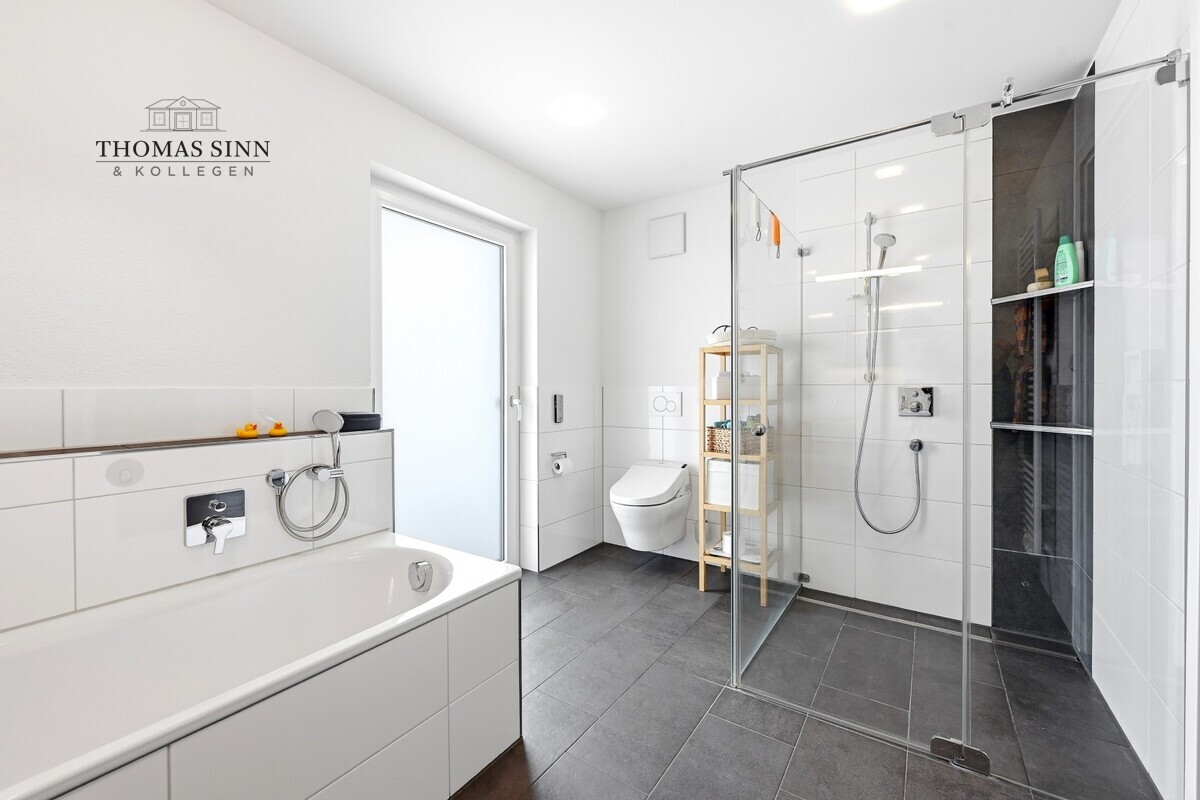 Das großzügige Tageslichtbad präsentiert sich in modernem Design und ist deckenhoch gefliest. Es verfügt über eine Badewanne, eine bodengleiche XL-Dusche, einen großen Waschtisch, einen Handtuchheizkörper sowie ein besonders hygienisches Toto-WC mit Selbstreinigungsfunktion. Ein separates Gäste-WC ergänzt den Komfort – ideal für Besucher.