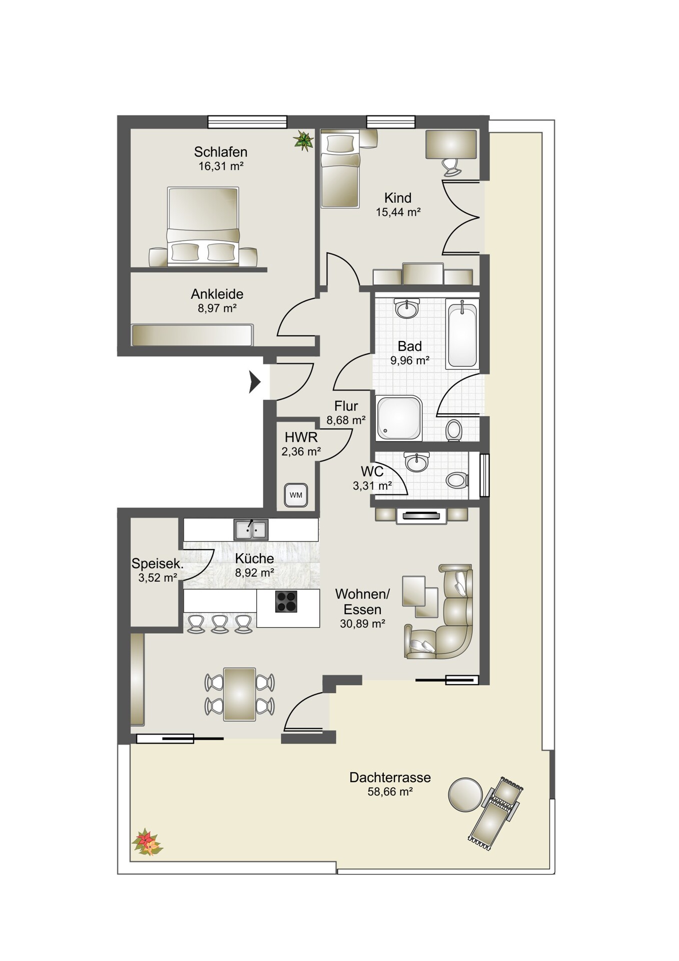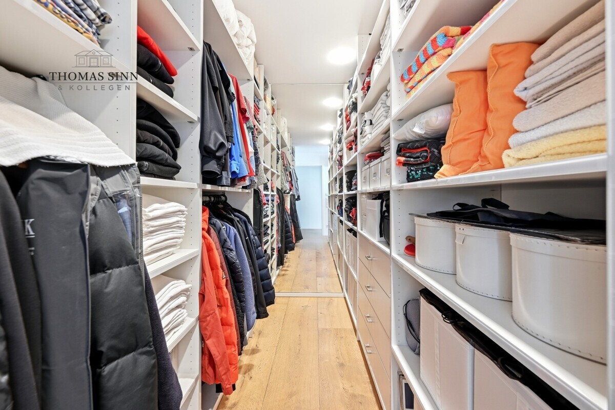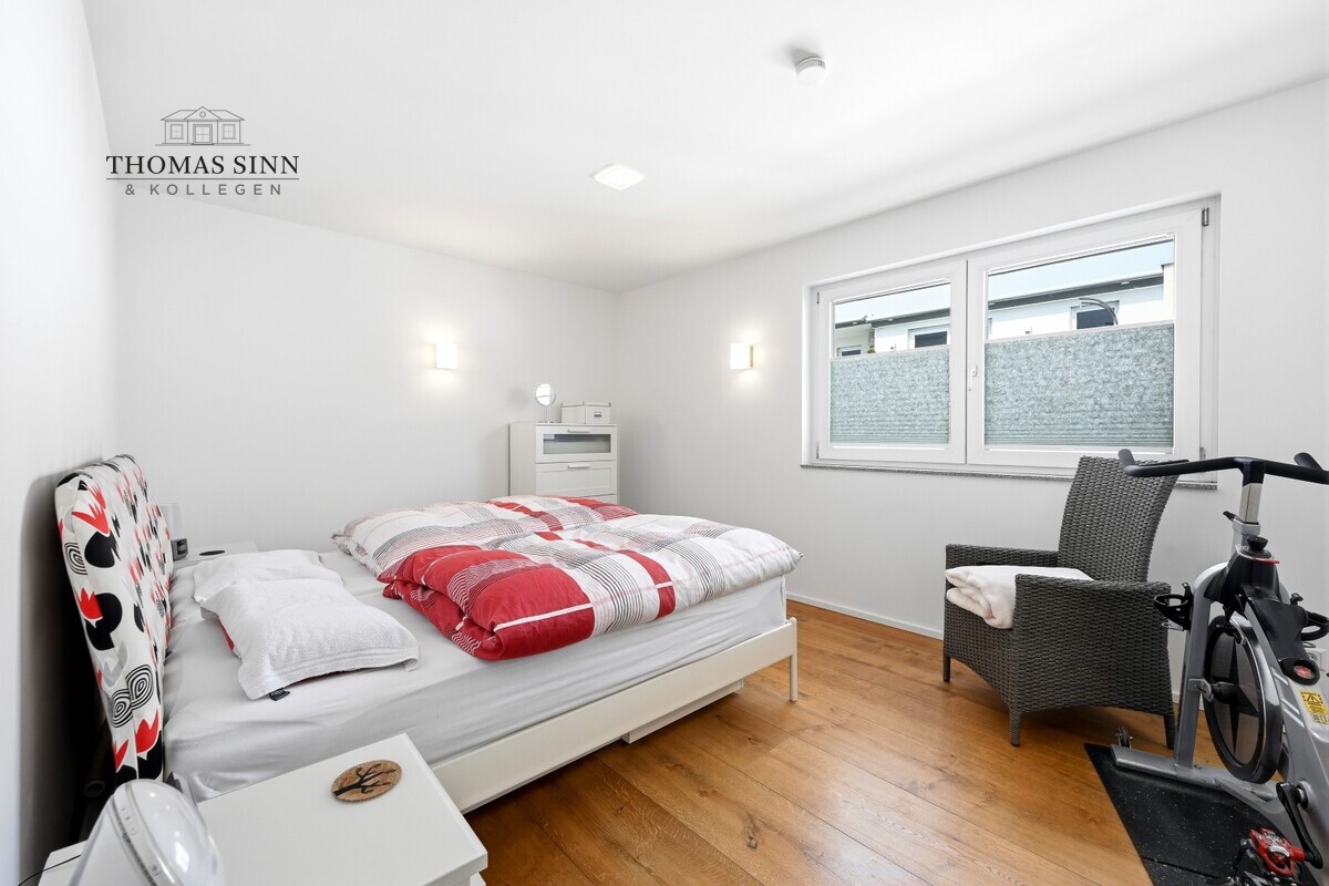 Das geräumige Schlafzimmer mit begehbarem Schrankbereich bietet viel Platz und Rückzugsmöglichkeiten. Ein weiteres Zimmer eignet sich flexibel als Arbeits-, Gäste- oder Hobbyraum. Beide Räume sind mit Klimageräten ausgestattet und sorgen so für ein angenehmes Raumklima zu jeder Jahreszeit. Vom Arbeits- bzw. Gästezimmer sowie vom Badezimmer aus gelangen Sie ebenfalls auf die umlaufende Terrasse – ein echtes Highlight für Frischluftliebhaber.