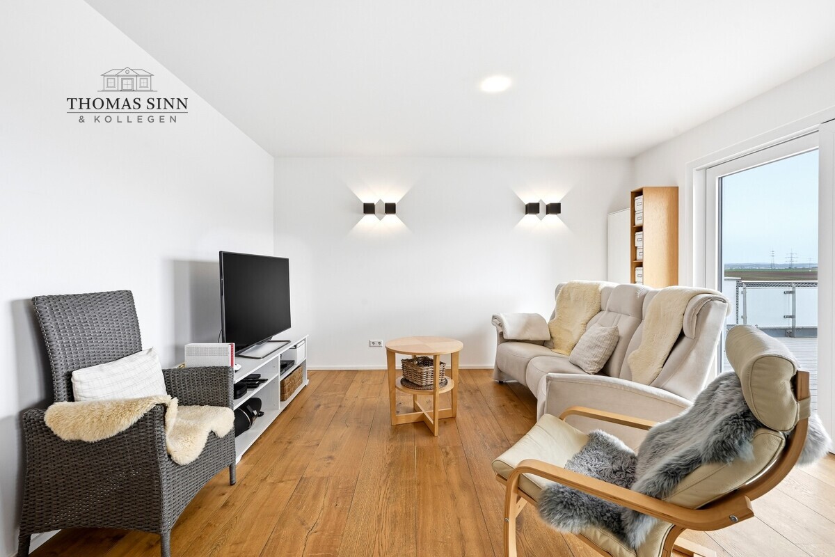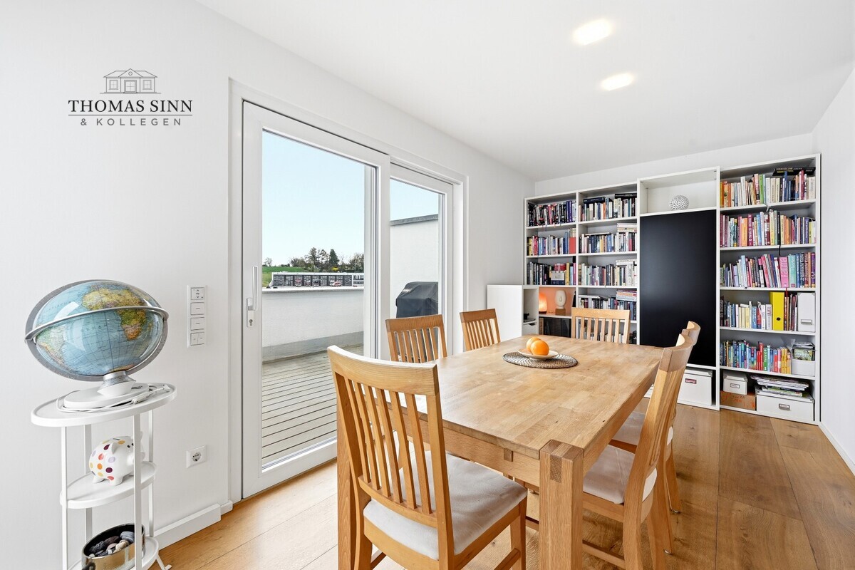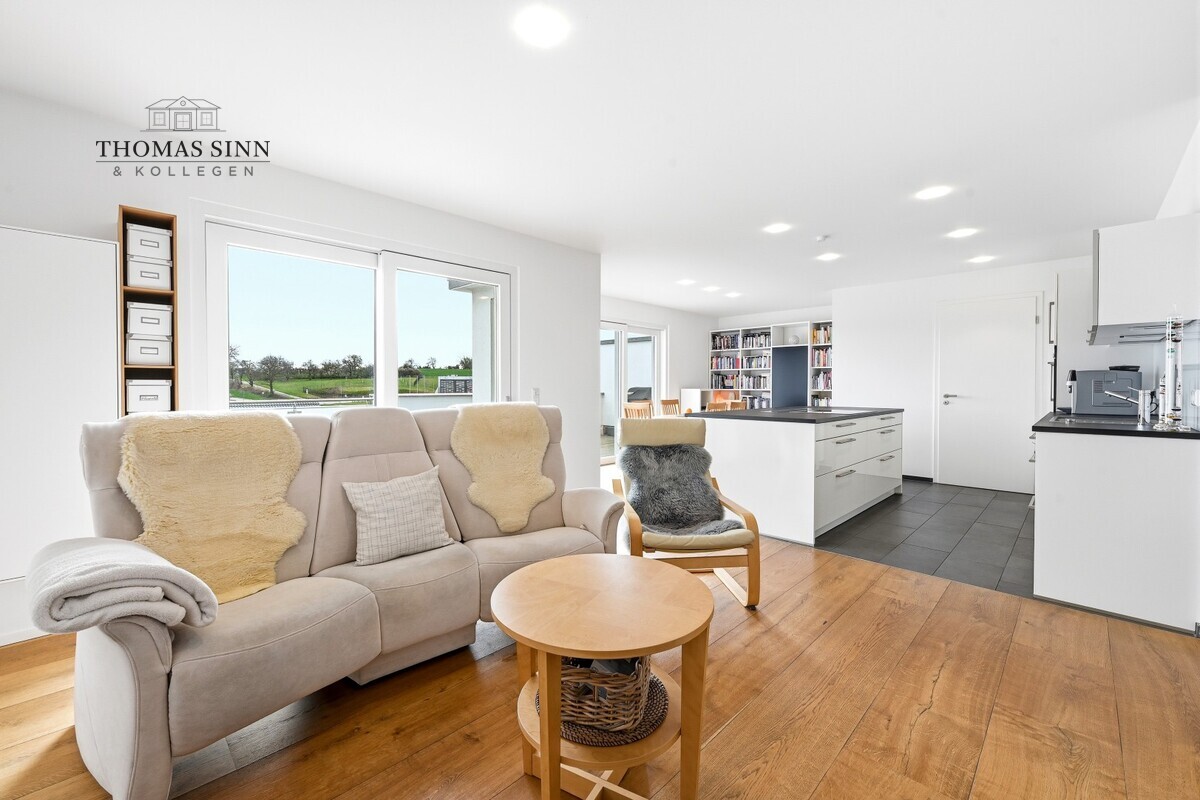 Der offen gestaltete Wohn- und Essbereich bildet das Herzstück der Wohnung. Er lädt zum Verweilen ein und bietet direkten Zugang zur großzügigen Sonnenterrasse mit Markise, von der aus Sie einen herrlichen Blick auf die umliegenden Wiesen und Felder genießen können.