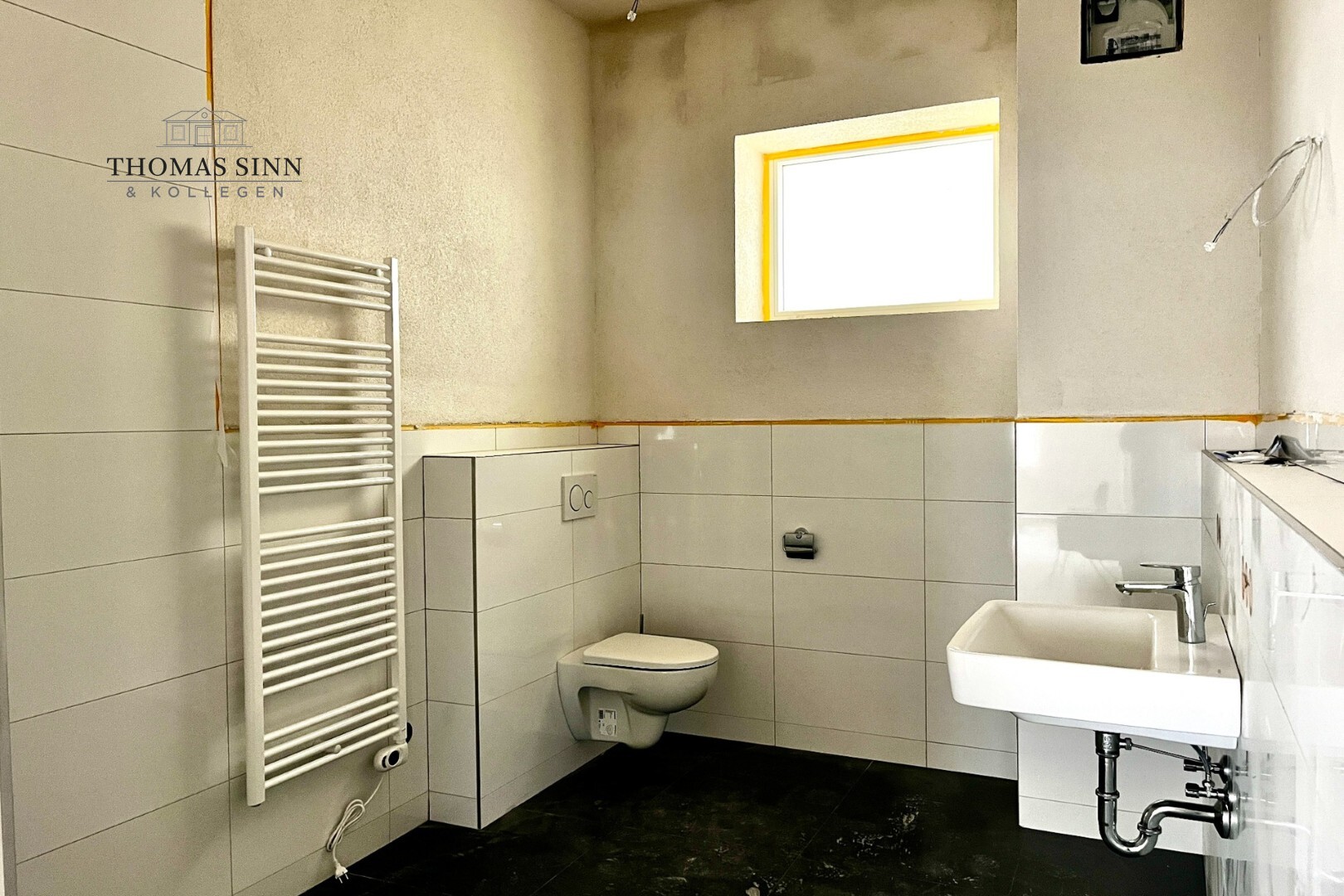 Das Tageslichtbad ist modern und stilvoll ausgestattet mit bodengleicher Dusche, Waschbecken und Toilette. Ergänzt wird der Komfort durch einen praktischen Hauswirtschaftsraum mit Waschmaschinenanschluss innerhalb der Wohnung.