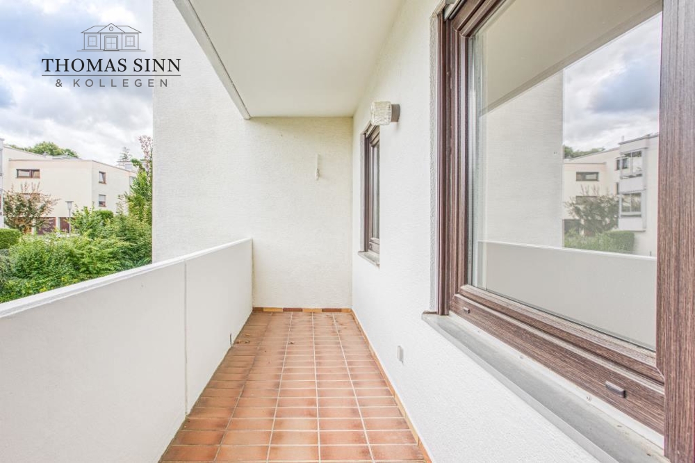 Im Anschluss liegt einer von zwei Balkonen mit Blick in den begrünten Garten. Dank der großzügigen Grundstücke gibt es keine direkten Nachbarn.